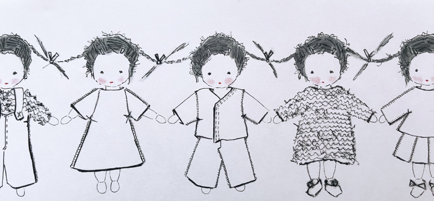 -Hand-drawn accordeon booklet containing the work description and sizes of this doll.